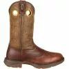 Make working hard and playing hard easier on the feet with these mens western boots. Stylish and durable, they have a subtle leather upper with a harness trap. Antique hardware adds to their charm while giving a rugged vibe. These 11-inch, welt-constructed boots have a steel shank for added support and reinforced stitching for added durability. The oil- and slip-resistant rubber outsole is flexible and built to last.