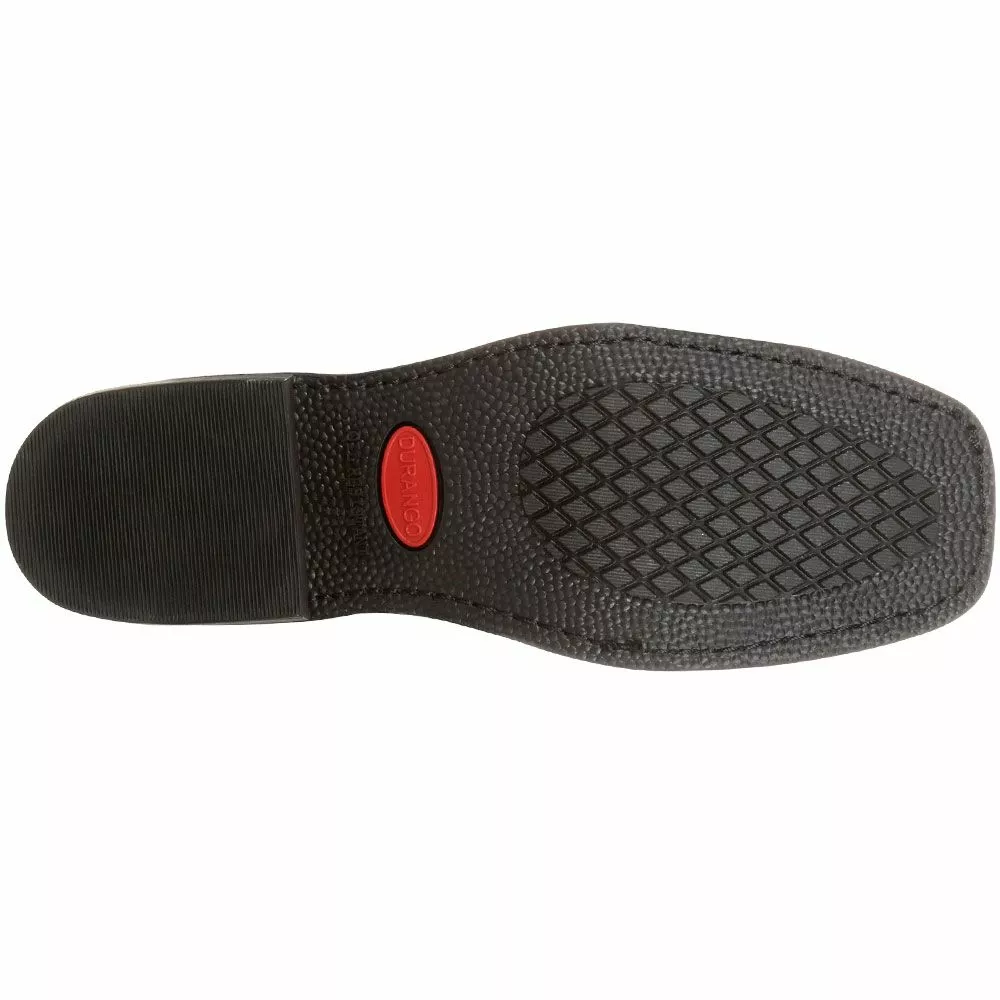 Kick up dirt in style wearing these mens western boots. The stylish square toe is complemented by an ankle harness with antique metal and a faux-leather shaft with a flag graphic. While they look good enough for a night out, they are made for working hard too. Featuring welt construction and a supportive steel shank. The EVA midsole keeps steps flexible and absorbs shock. Whether in the shop or outdoors, the outsole is slip- and oil-resistant.