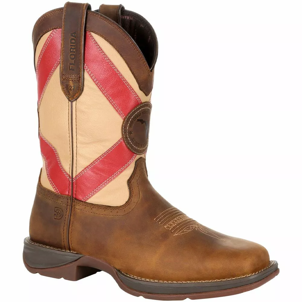 You can rely on these mens western boots. The stylish square-toe silhouette is complimented by a faux-leather shaft adorned with the Florida state flag. Designed for men who work hard, these boots feature the innovative Durango Suspension System. That includes a double-layered insole, steel shank, flexible EVA midsole and rubber outsole with a rocker heel for all-around support.