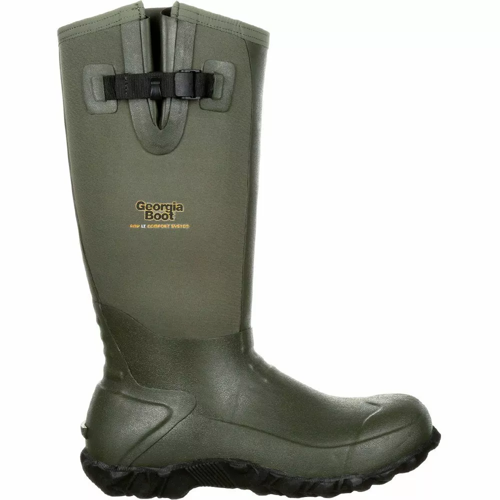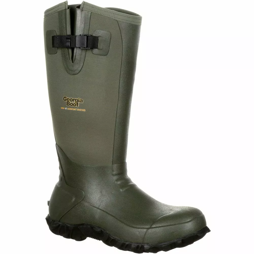 Georgia Boot Gb00230 Winter Boots – Mens. Cold, wet weather shouldn’t keep you from getting things done. These mens winter boots take waterproofing and comfort to the next level, letting you face whatever Mother Nature throws your way. These 16-inch vulcanized rubber boots are designed to provide maximum traction and warmth. They keep the moisture at bay outside while providing cushioned breathability inside. When the work is done, they feature a heel kick plate to make taking them off easy.