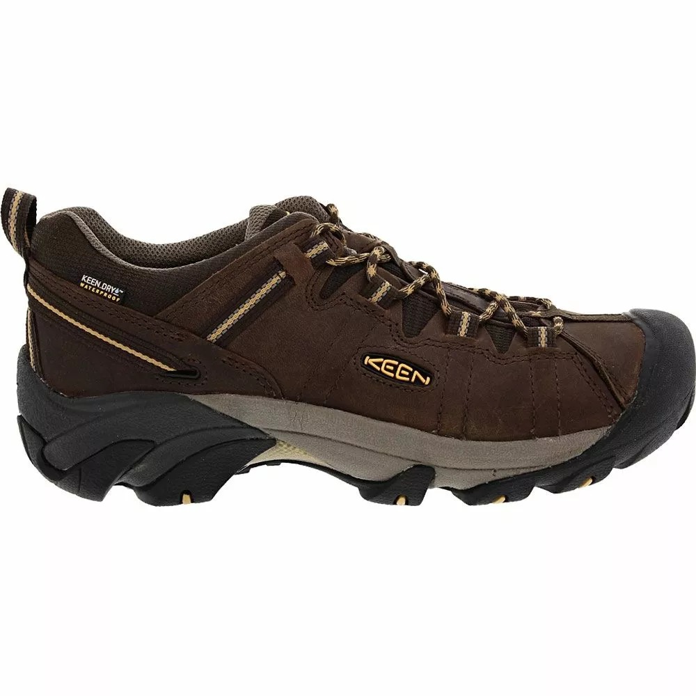KEEN Targhee 2 Wp Hiking Shoes – Mens. Agile, waterproof and all-terrain ready, KEEN’s Targhee II Hiker is an ideal choice for your next rugged expedition. It keeps you stable on uneven surfaces with sturdy multidirectional lugs at the outsole and a torsion stabilizing ESS support shank. The proprietary KEEN.Dry membrane keeps water out but maintains ample airflow, working alongside hydrophobic lining to ensure lasting comfort when the weather is disagreeable.