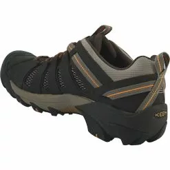 KEEN Voyageur Men’s Hiking Shoes. Outfit yourself for adventure in the KEEN Voyageur hiking shoe. This shoe features a leather upper with a mesh webbing underlay. Polyester linings wick moisture away from your feet and dry quickly to keep feet comfortable and dry. An ESS shank is built in for torsional stability, letting you keep your mind on the task at hand. Compression-molded EVA midsoles offer shock-absorption and padding for all-day comfort. Aggressive four-millimeter outsole lugs grip rock, sand, mud, and scree.