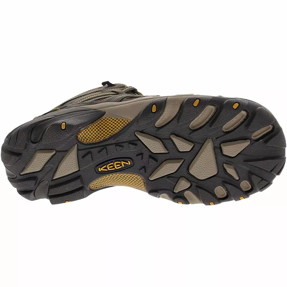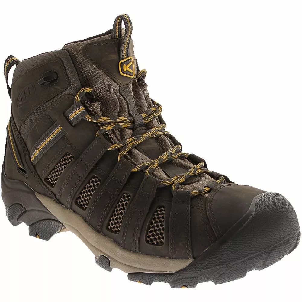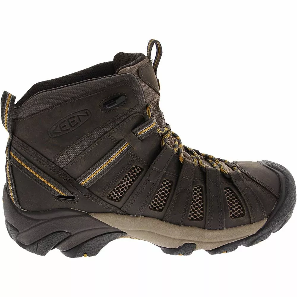 KEEN Voyageur Mid Men’s Hiking Boots. No need to wait for an engraved invitation to get outdoors when you have the KEEN Voyageur Mid hiking boot. Stay dry with the water resistant leather upper. The S3 heel support structure is engineered to support the foot on impact, dissipate shock and reduce your odds of twisting an ankle. Get excellent traction from the non-marking rubber outsole and the 4mm lugs.