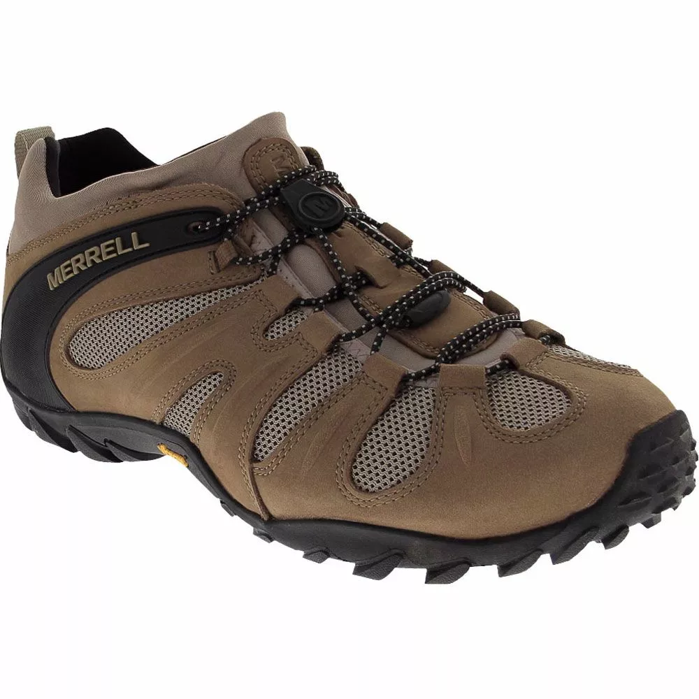 Merrell Chameleon 8 Stretch Hiking Shoes – Mens. Lightweight and flexible, Merrell Chameleon 8 Stretch Hiking Shoes might not feel like hefty mens hiking shoes, but quality materials and precise engineering keep every footstep in line to give you the comfiest hike ever without skimping on protection. High-grip treads start the stability from the ground up. EVA foam, a Merrell air cushion, contoured insoles and a TPU molded heel all work together to provide the perfect surrounding for each foot. The uppers are fitted with bellows tongue guards and elastic lace locking systems to keep debris out for a safer, healthier hike.