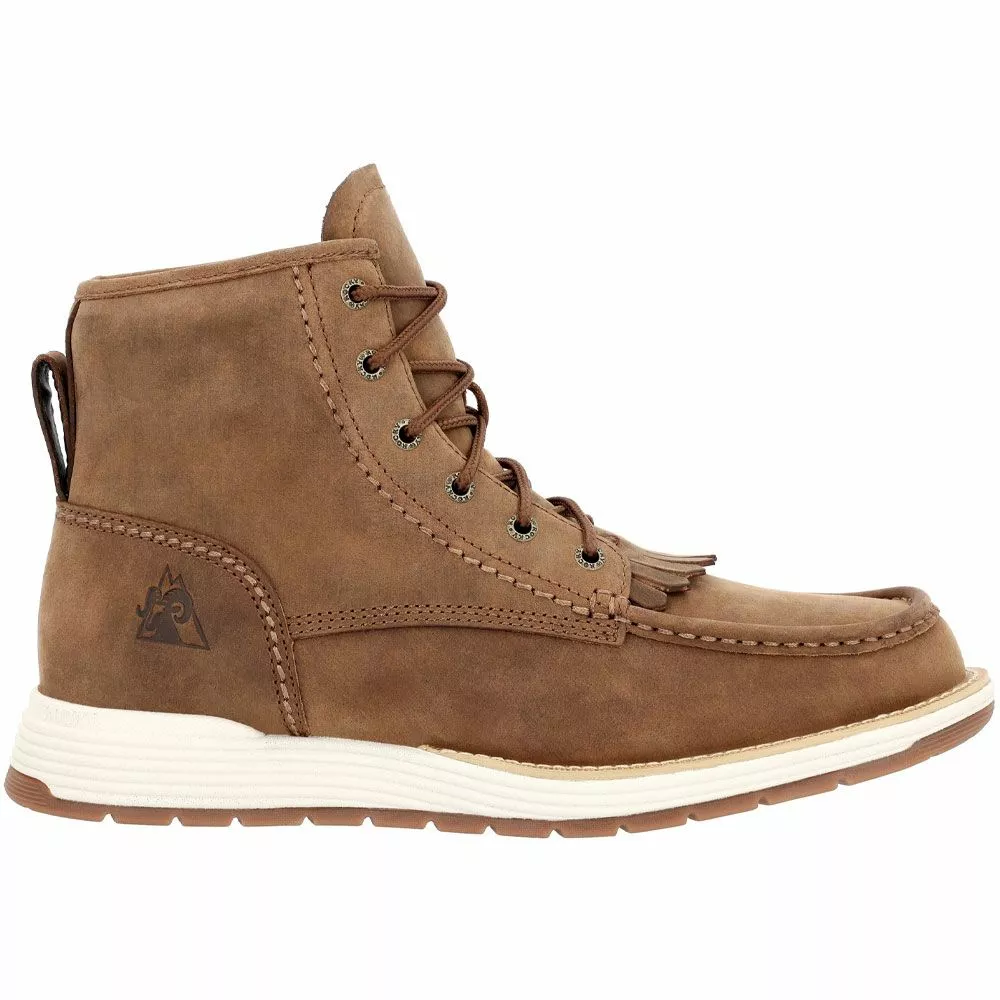 Let your western vibe subtly shine while enjoying all-day comfort in a pair of Rocky Farmstead mens casual boots. Designed for work or play, the leather upper has stitching accents and brush guard kiltie that gives them a unique spin. While you focus on staying on the move, your feet will enjoy cushioning support thanks to a dual-layer footbed, flexible PU midsole and fiberglass shank. No matter the conditions, the rubber outsole provides reliable traction.