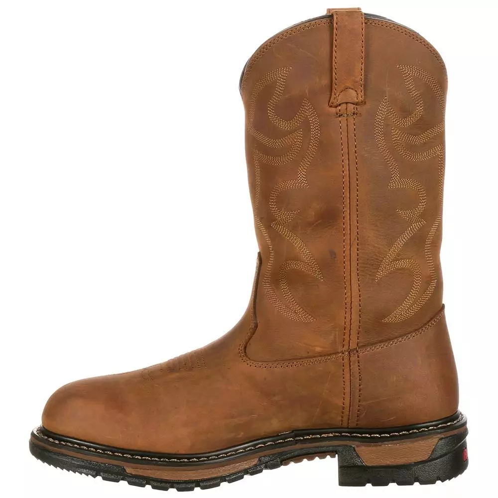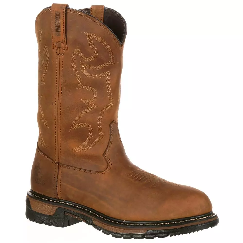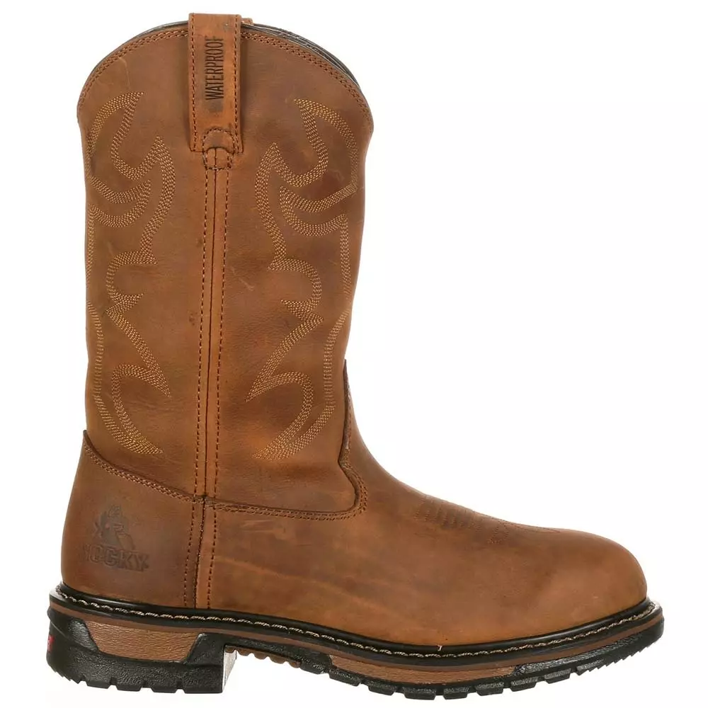 Rocky Ride Branson Roper Waterproof Mens Western Boots. The traditional cowboy boot has been modernized. The Rocky Ride Branson Roper is a waterproof western boot. The 10-inch shaft is constructed from full-grain leather accented by traditional western stitching. Inside there is a dual-density PU footbed accompanied by a heel stabilizer. Providing even more support for arches is the built in tempered steel shank. The dual-density rubber outsole is oil resistant and supplies great traction. Remain dry and comfortable all day while wearing these durable western boots.