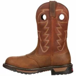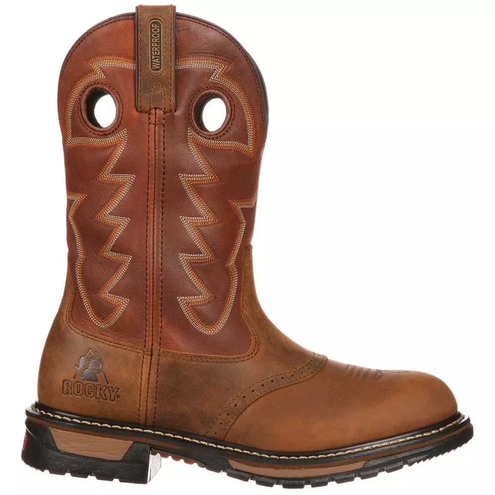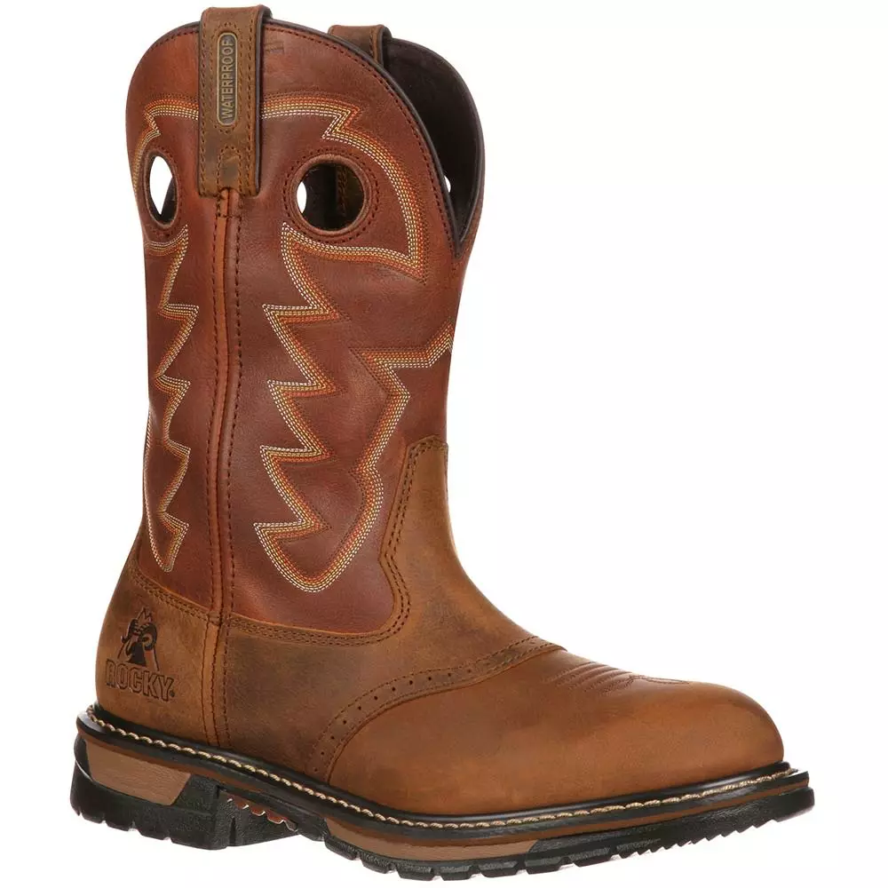 Rocky Ride Branson Saddle Mens Western Boots. Pull on a boot that performs. The Rocky Branson Saddle is a waterproof western boot. The 11-inch shaft is made from full-grain leather with complementary stitching. Supporting feet is the built in tempered steel shank and heel stabilizer. Cushioning feet is the dual-density PU footbed to comfort feet throughout each day. The rubber outsole has many hidden talents. It protects feet from oils, heat and abrasions. Get excellent performance and comfort wearing these round toe western boots.
