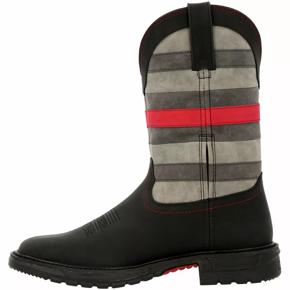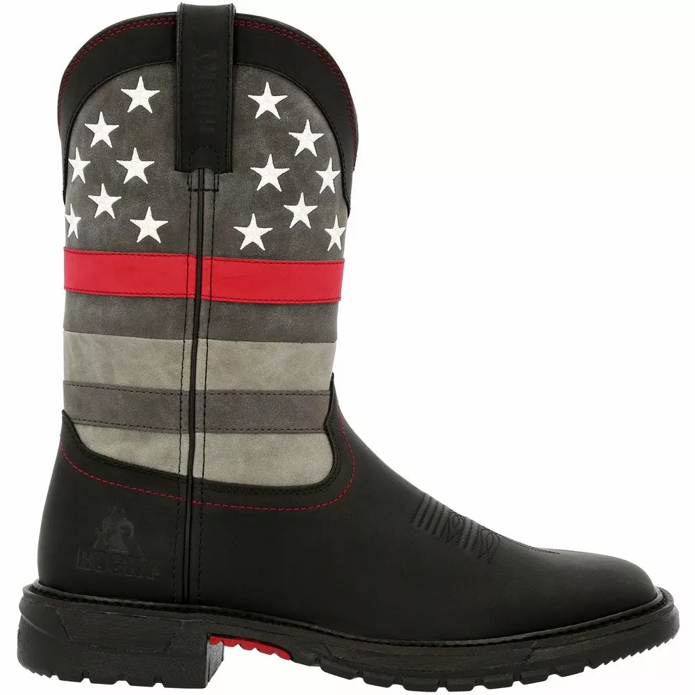 Whether work or play, these mens 11-inch western boots let you exude your unique style, support, and pride in your country. Made with genuine leather, the upper features a square toe, side straps and a colorful shaft adorned with stars and stripes. Designed for all-day comfort, the innovative comfort system cushions and supports every step. The flexible seam makes them easy to pull on and kick off.