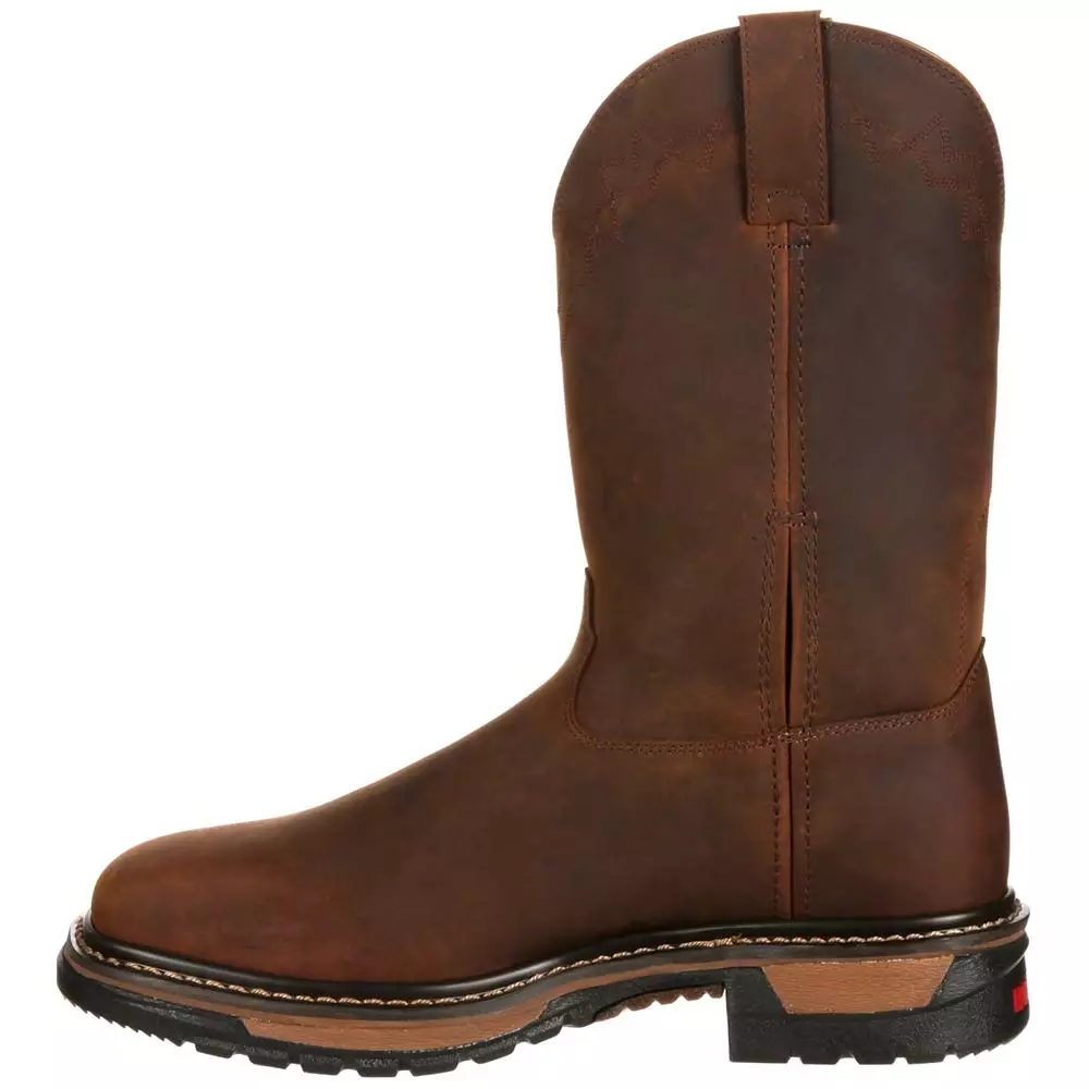 Rocky Original Ride RKW0131 Mens Pull On Western Boots. The traditional western boot has gone back to its roots. The Rocky Original Ride is a simple square toe boot. The 11-inch tall shaft is made of unstitched full-grain leather. A series of layers, including a dual-density PU footbed and EVA midsole, creates comfort that contours to the shape of feet. Providing needed support is the tempered steel shank and heel stabilizer. The boot’s last layer of protection is the oil-resistant rubber outsole with a sturdy 1.5-inch heel. Get back to the basics and invest in these comfortable western boots.