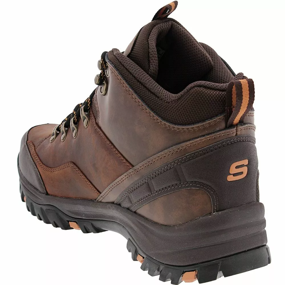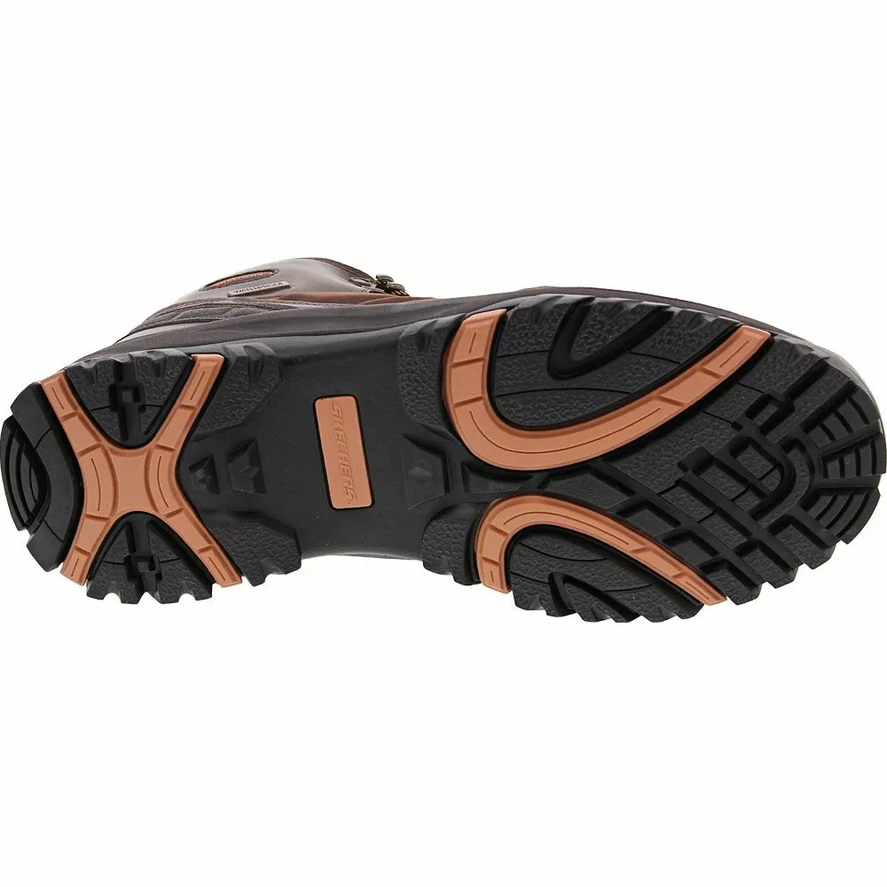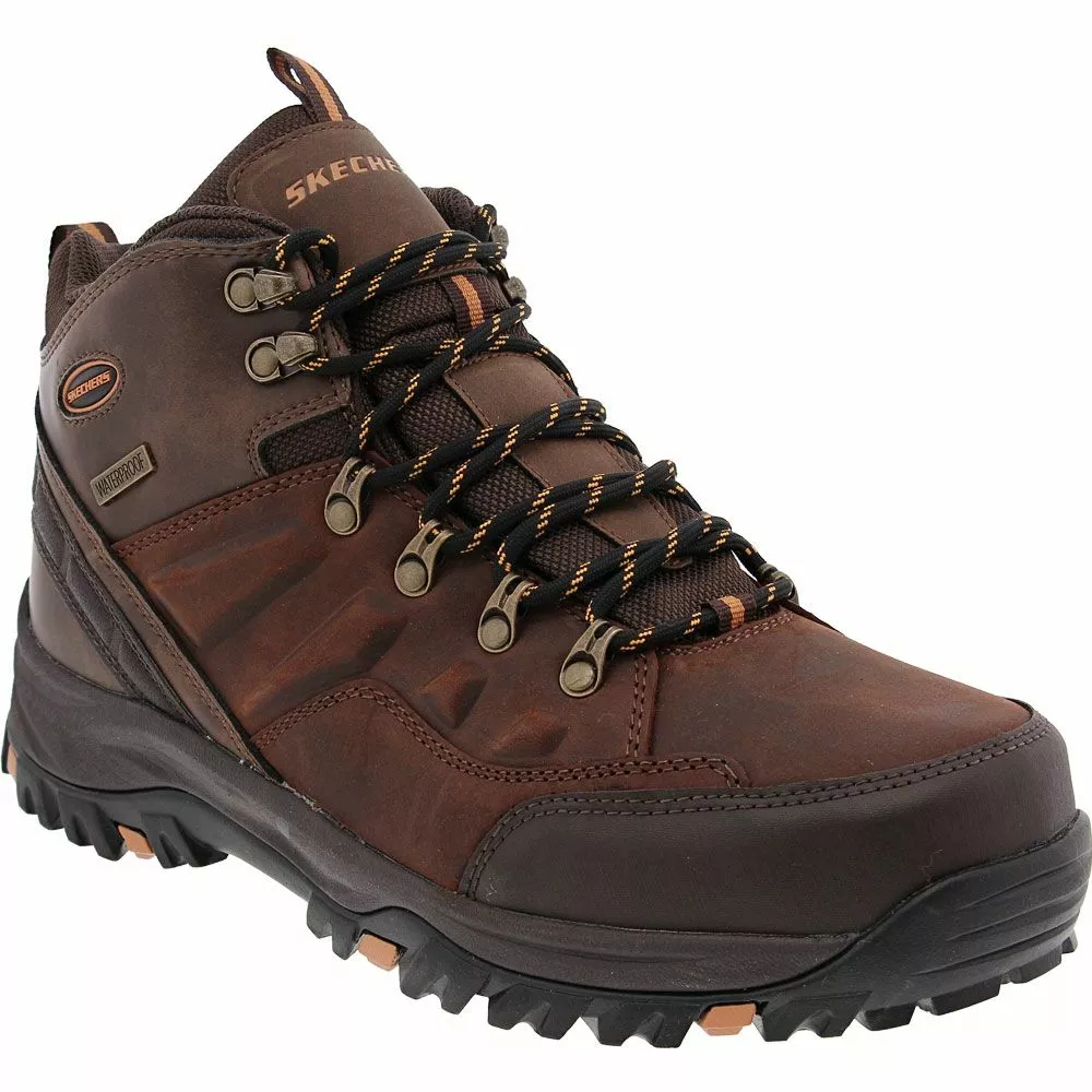 Skechers Relment Traven Relaxed Fit Hiking Boots – Mens. Take on the next adventure with cool confidence wearing these mens hiking boots. Durable, rugged and stylish, they pack a punch whether facing wet or dry conditions. The soft leather upper is waterproof and resistant to staining. Once on the go, they have a breathable lining to keep feet dry and a memory foam footbed for maximum comfort. The flexible EVA midsole helps stabilize strides on uneven terrain while the rubber outsole ensures optimal traction.
